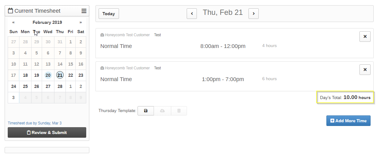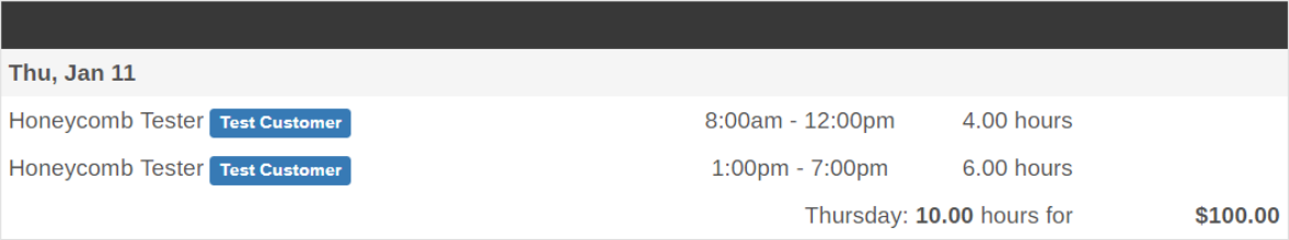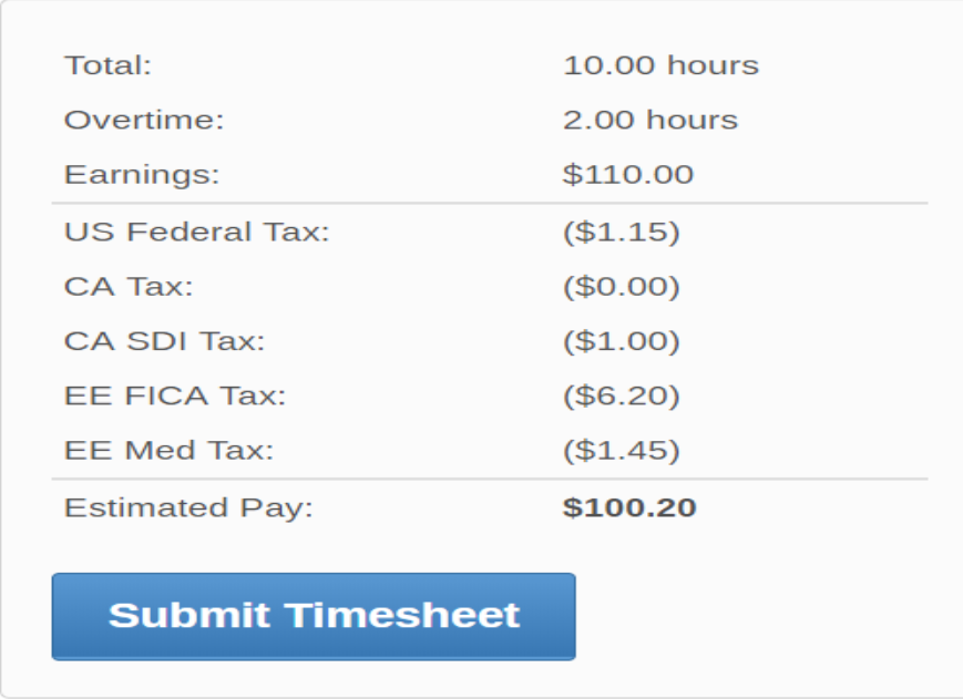 When you review your timesheet to submit it for approval, you’ll see total hours worked (10), for a total pay of $100: